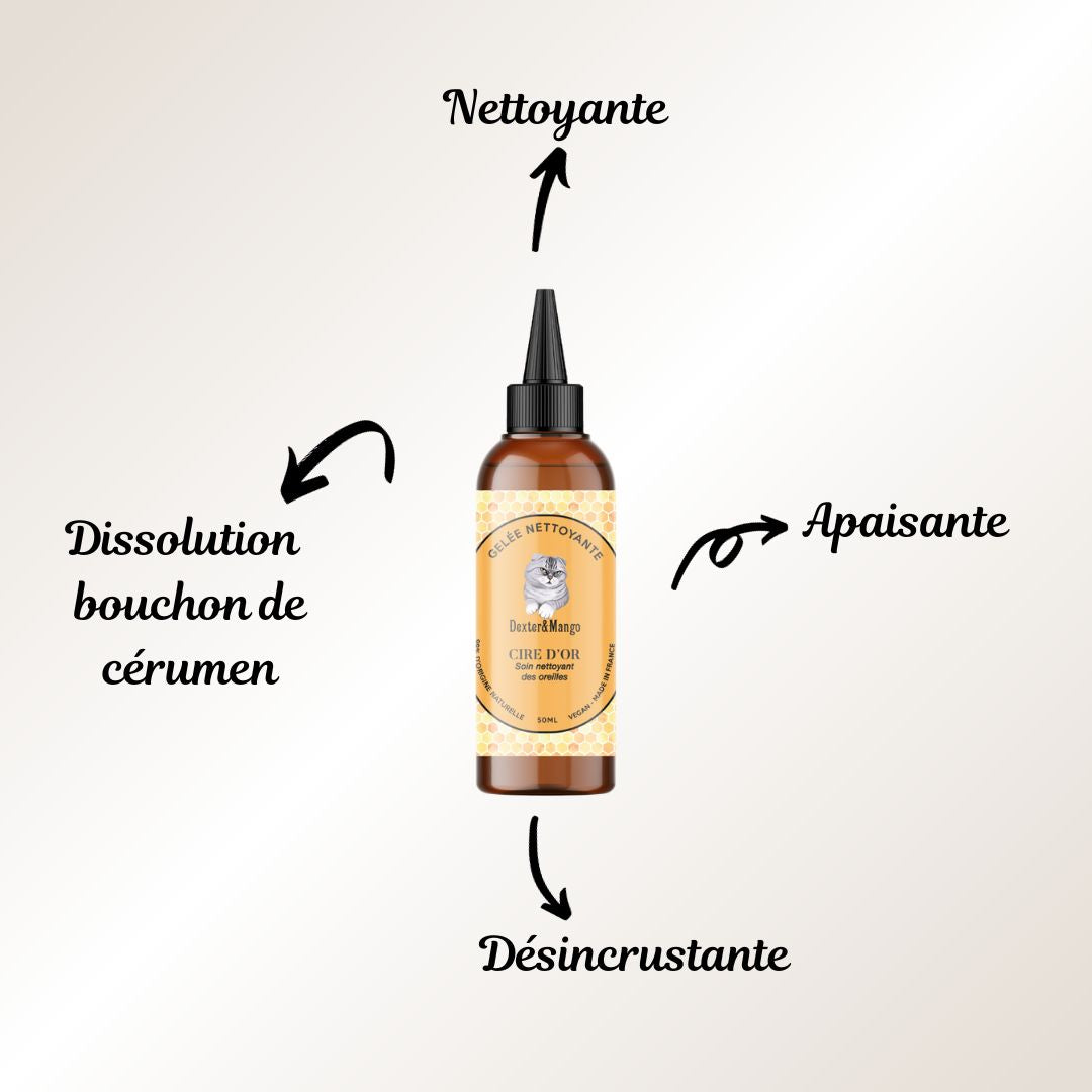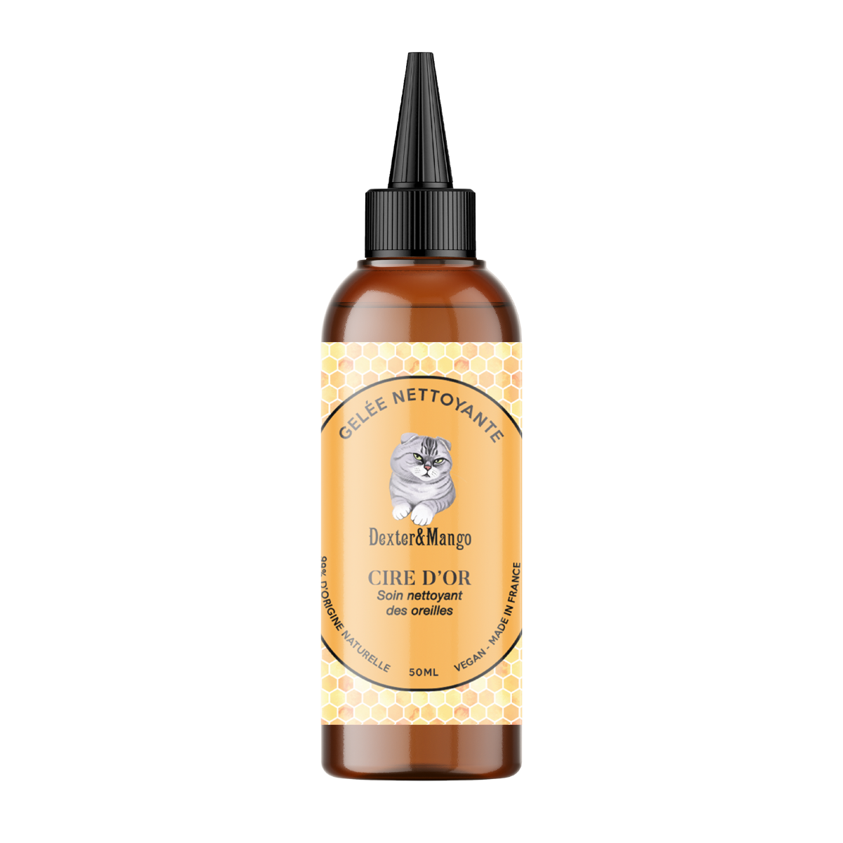 La gelée "Cire d'Or" : une formule 99% naturelle pour des oreilles de chat impeccables ! Nettoie en douceur avec des hydrolats bio et des huiles végétales, élimine saletés, sécrétions, et soulage les démangeaisons.